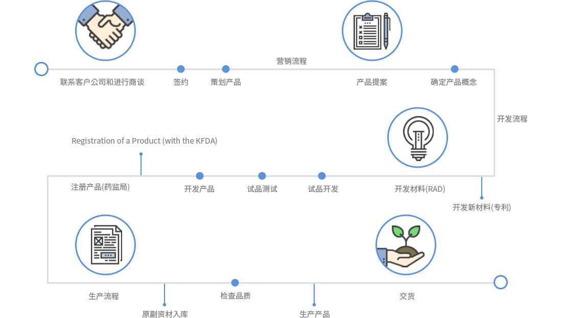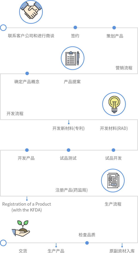 Huons Foodience根据顾客需求(Needs)以袋装(条装、站立式、四面、形状)系列、流动层果粒系列、丸系列(大丸、小丸)、片剂系列(片,硬胶囊),切片系列、冻结干燥系列的专门技术为基础,打造可靠食品的OEM方式与以本公司拥有的企划和专业性为基础,构建提供从产品企划到开发、质量管理、生产、出货的全过程服务的ODM方式。
