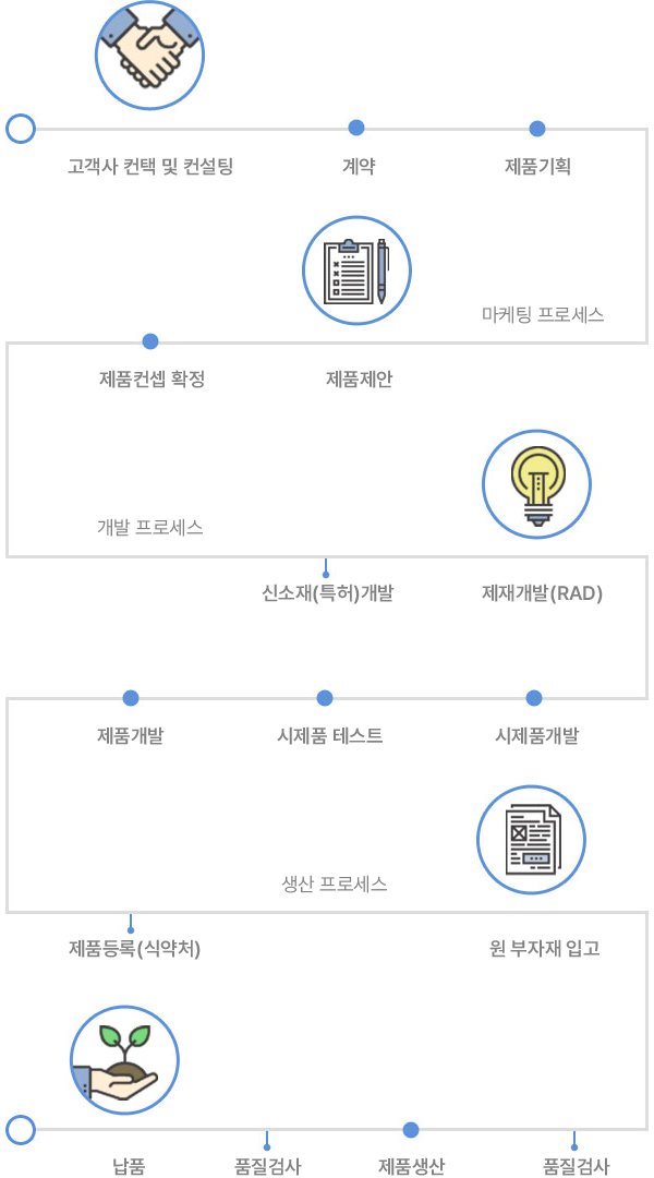 (주)휴온스엔은 고객의 니즈(Needs)에 따라 파우치 (스틱, 스탠딩, 사면, 형상)라인, 유동층과립라인, 환라인 (대환, 소환), 정제라인 (타블렛. 하드캡슐), 절편라인, 동결건조라인의 오래된 노하우를 바탕으로 믿을 수 있는 식품을 제조하는 OEM 방식과 당사에서 보유한 기획과 전문성을 토대로 상품의 기획부터 개발, 품질관리, 생산, 출하에 이르는 전 과정 서비스를 제공하는 ODM 방식을 구축하고 있습니다.